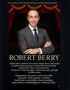 Robert Berry is a class act. Everyone loved him and he was so amazing. He had everyone in awe of his magic. It was truly a magical experience. He is talented and really knows how to keep everyone’s attention no matter their age. I highly recommend him. Thank you Robert for a night to remember. Everyone is still talking about his performance that had us all mesmerized.